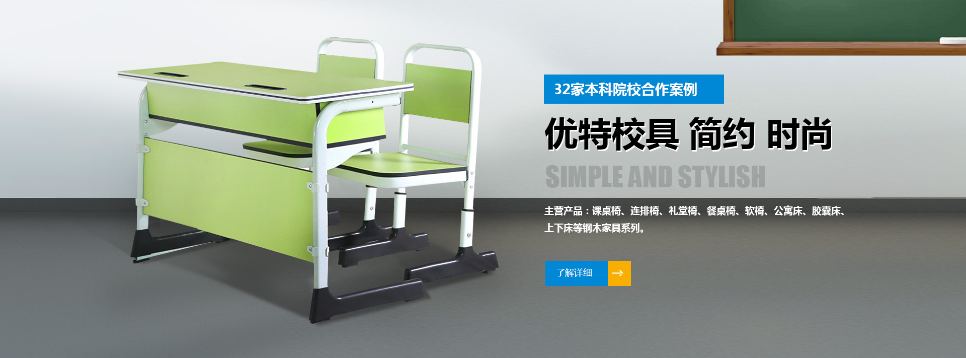 我公司位于河南省偃師市首陽(yáng)山鎮(zhèn)石橋村北環(huán)工業(yè)區(qū),是集研發(fā)、制造、銷售、服務(wù)為一體的綜合性學(xué)生課桌椅廠家,產(chǎn)品主要有課桌椅、連排椅、禮堂椅、餐桌椅、軟椅、公寓床、膠囊床、上下床等鋼木家具系列。可根據(jù)客戶需求提供定制化方案。
